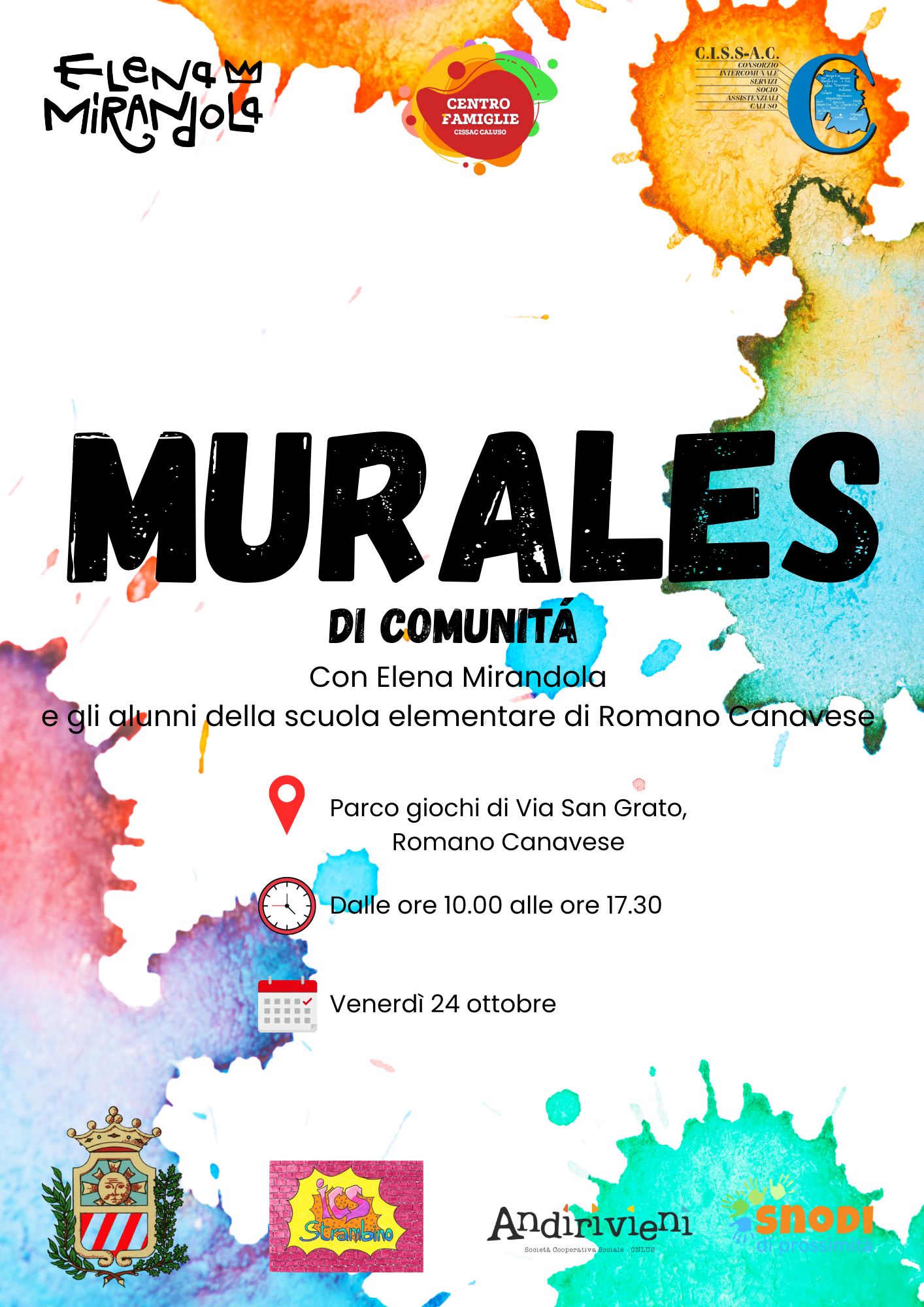 Il giorno 24 ottobre dalle ore 10.00 alle ore 17.30, l'artista eporediese Elena Mirandola con la collaborazione degli alunni della scuola elementare A.Romero di Romano Canavese, si cimenterà nella creazione di un murales di comunità che permetterà agli alunni, ma anche ai cittadini che desiderino essere presenti, di partecipare in maniera attiva alla progettazione e realizzazione di un'opera d'arte pubblica, lasciando così il proprio segno per la collettività.